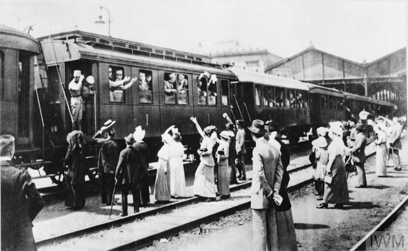 Civilians waving farewell to Austro-Hungarian troops on board trains about to depart for war service.