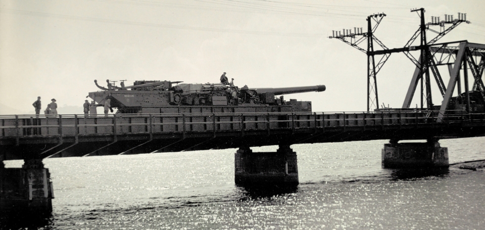 BELOW: The gun is lowered and secured by clamps, ready for railway movement. In this photo the gun over the railway bed is only about the same height as the man at the raising and lowering controls. The bottom of the pivot wheel is the same height as the railway chassis.