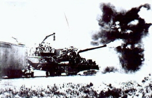 ABOVE: Notice the height of the gun over the railway bed is about twice the height of the man standing beside the gun to handle the raising and lowering controls. The bottom of the pivot wheel of the gun is about six feet above the railway chassis.
