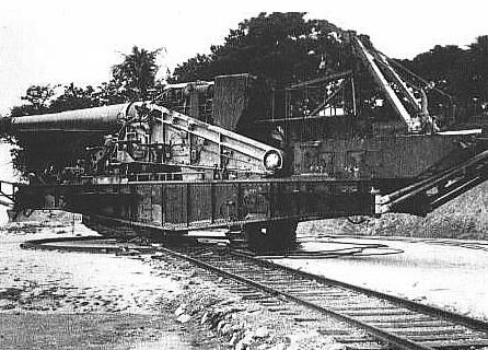 One of the two 14-inch two railway guns on Culebra Island in Panama is shown dismounted here in a 1932 photograph. The two guns on Culebra Island had a maximum range of 48,000 yards (twenty-seven miles). Notice the front and rear railroad bogies located just out from under the gun emplacement. Behind them, to the right, is an ammunition car to support the gun.