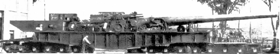 For transport, the gun sat on 6-axle and 8-axle trucks as seen in the above photos. The height was significant as well – In its lowered traveling position, the top of the transported gun stood nearly 20 feet off the rail. It could barely clear tunnels and bridges. In this transit position, the barrel could be depressed and secured down by clamps.