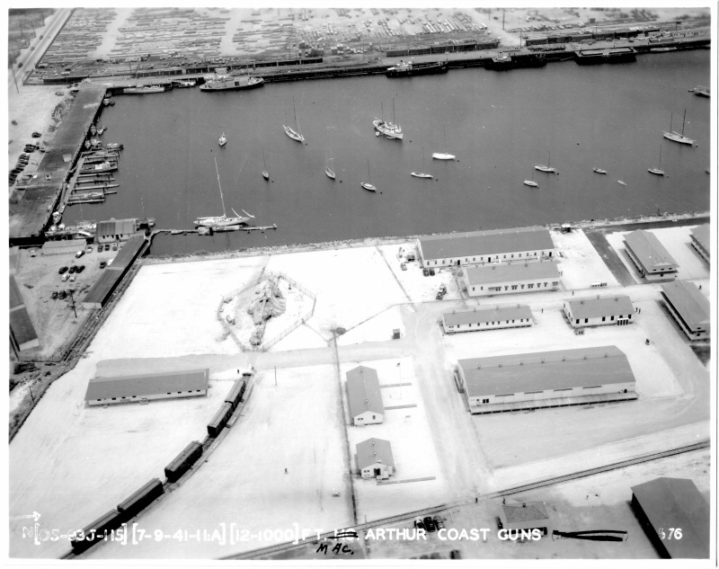 Battery Erwin's northern emplacement 9 July 1941. The gun is under camouflage netting. The five box cars are the support cars described above. Notice no siding exists to hide the Powder Car behind an earthen berm or alternate Powder and Shell Car order behind the gun for reloading. Image was taken by the California National Guard's 115th Observation Squadron. (National Archives and Records Administration)