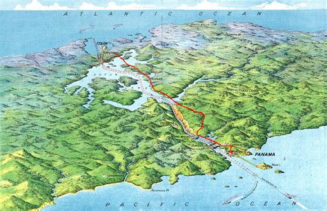 The railroad route shown alongside the canal route to each coast of the Panama Canal.
