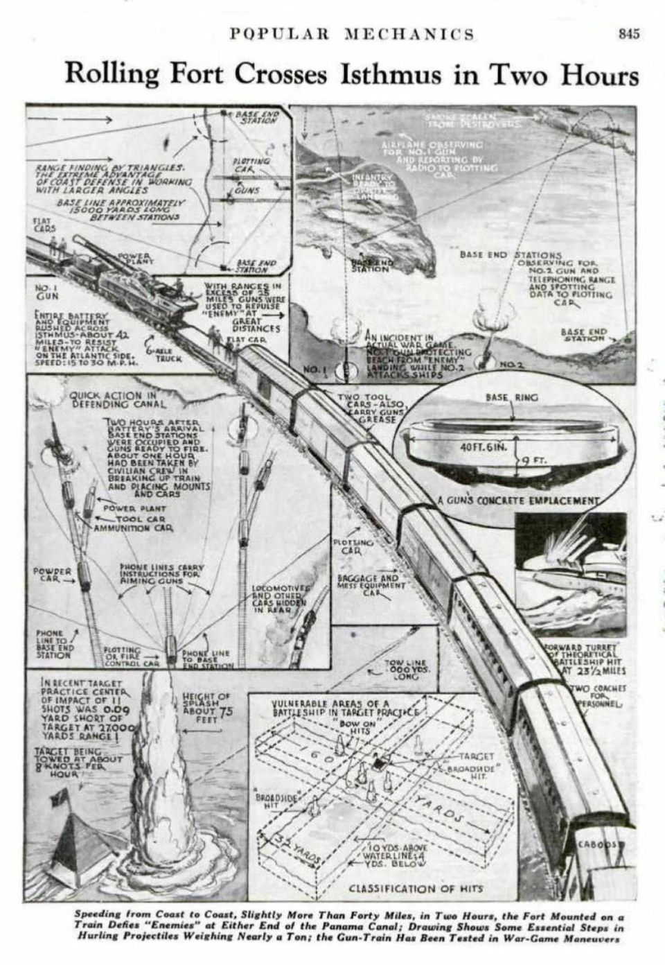 Two of these guns were stationed in Panama at for use at Fort Grant and Fort Randolph in the Panama Canal Zone, where they could be moved to either coast on the Panama Canal Railway. The article included detailed illustrations of the railway guns and their operations, describing the engineering feats achieved to safeguard this critical maritime passage.